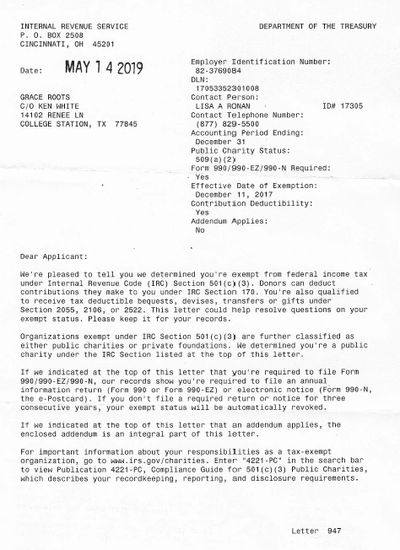 Grace Roots is a 509 (a) (2) charity under the Internal Revenue Code. A 509 (a) (2) is a type of 501 (c) (3). They are both public charities. The primary difference between Grace Roots and other Christian charities with a 501 (c) (3) designation is that Grace Roots collects most of its revenue through events which are then used to support Gospel transformation in under-resourced places. We have included our IRS determination letter here for verification purposes. Thanks for supporting this strategic mission!